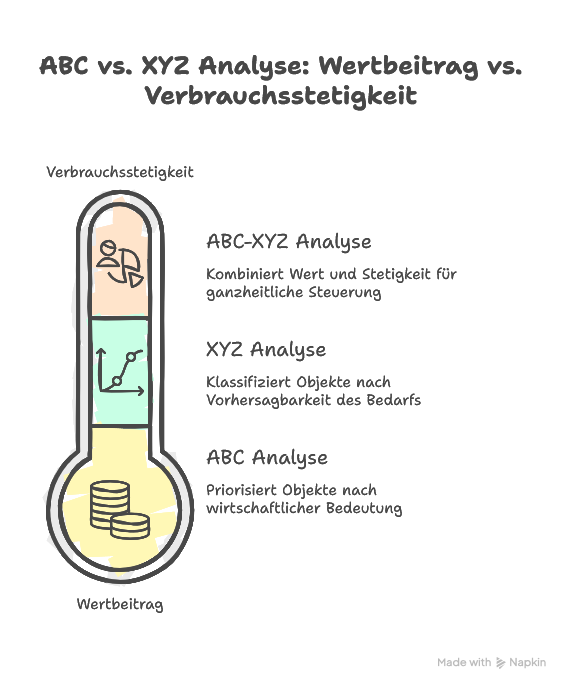 Die ABC Analyse bewertet Objekte nach ihrem Wertbeitrag, die XYZ Analyse nach ihrer Verbrauchsstetigkeit. Beide betrachten also unterschiedliche Dimensionen derselben Objekte.